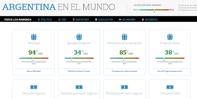 Dentro de cada tema encontramos cuadros interactivos sobre variados asuntos relacionados directamente con cada uno de estos cuatros nombrados anteriormente. En estos cuadros, a simple vista, vemos la ubicación de Argentina en el Ranking. Al ingresar, se muestra el ranking completo, mostrando las ubicaciones de muchos países en el mismo tema y, en algunos casos particulares, también podemos observar la involución o evolución de los mismos, ya que nos permite ver los rankings de años anteriores.