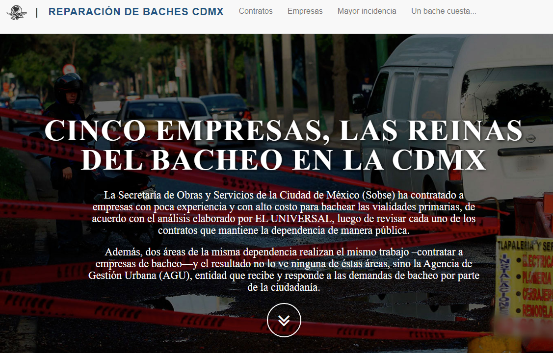En la pieza «Cinco empresas, las reinas del bacheo en la CDMX» se da cuenta de las cinco empresas que fueron contratadas para hacer bacheos en la vialidad primaria de la ciudad de México.
