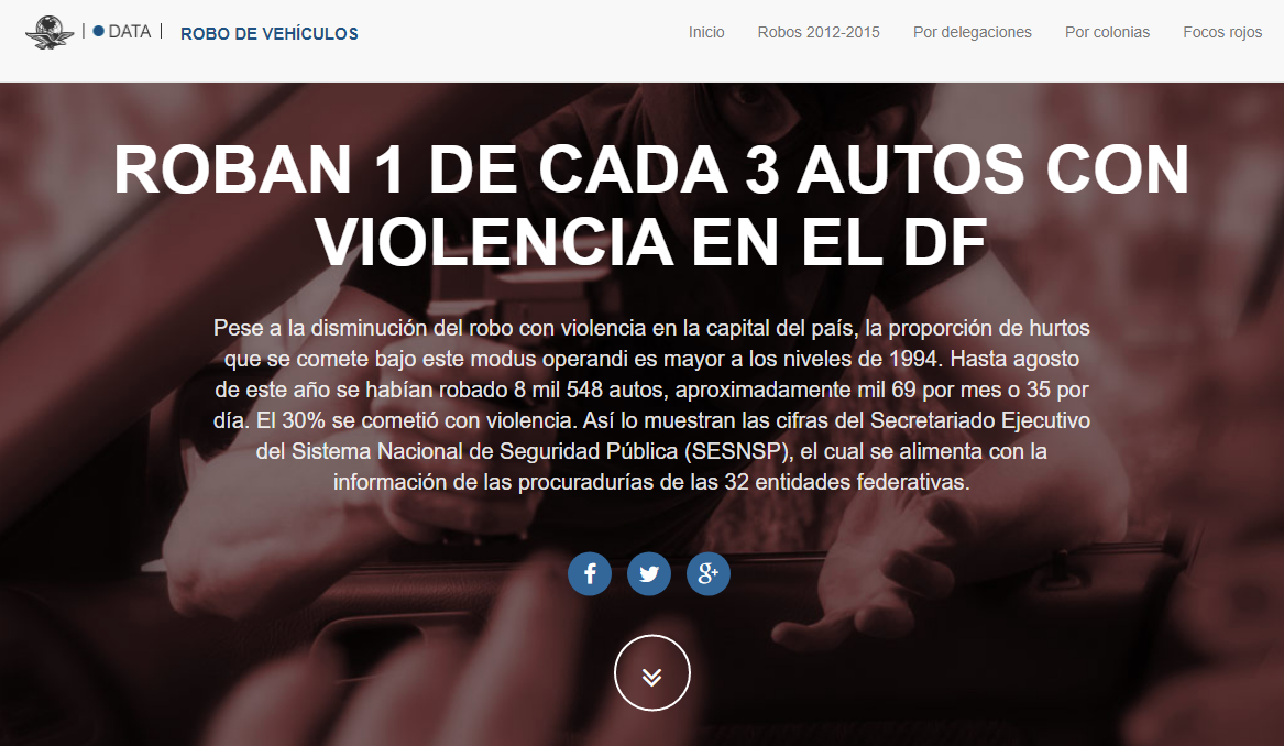 Se repartió la información mediante mapas interactivos y gráficos de barras. Cada dato que se puede observar se encuentra detallado, incluyendo niveles de incidencia de los delitos por delegaciones, así como en cuáles de estas es mayor la violencia.