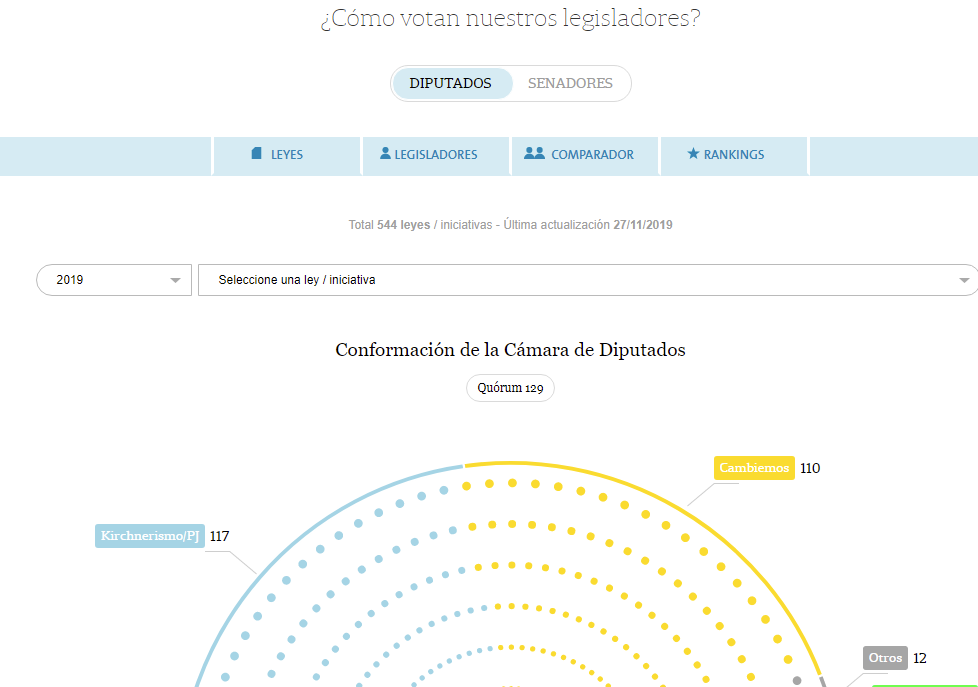 Una de las características mas destacables de la página es el uso de gráficos y sus referencias, hacen que la información sea más llamativa y sencilla de comprender, teniendo la alternativa de descargar los datos que se necesiten. También posee tablas comparativas y la posibilidad de ver en fotos a cada uno de los legisladores que forman parte del Congreso.