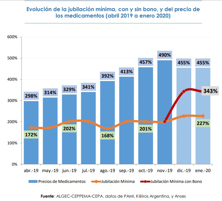 Según un informe realizado por el Centro de Economía Política Argentina (CEPA) realizado en febrero de este año, ilustra que la jubilación mínima aumentó de un 268% entre mayo de 2015 y dicho mes. A su vez, se les otorgó un bono extraordinario de $5000 a los jubilados y pensionados que para ese momento cobraban $14.068, generando un aumento de casi el 400%.